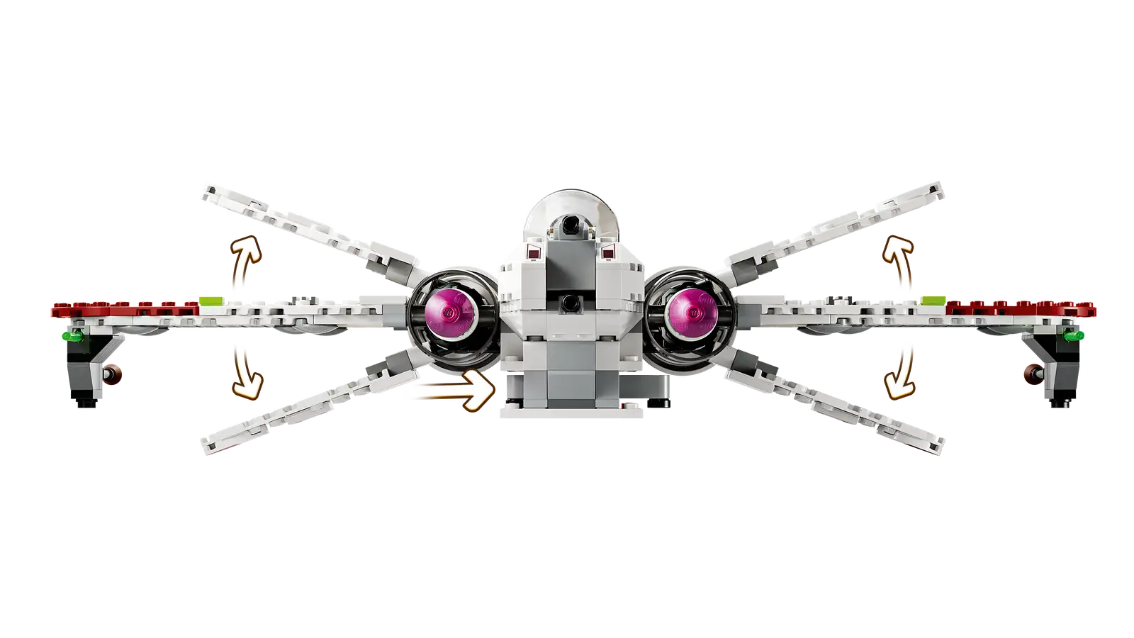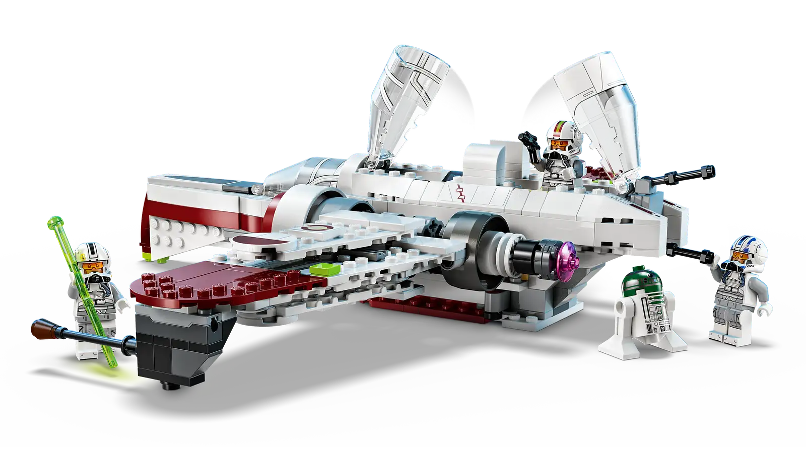 The buildable starship playset includes 4 LEGO Star Wars characters. The Clone Pilot Odd Ball, Clone Pilot Jag and Clone Pilot LEGO minifigures can be placed in the cockpits, and there is also space on board for the R4-P44 LEGO droid figure.