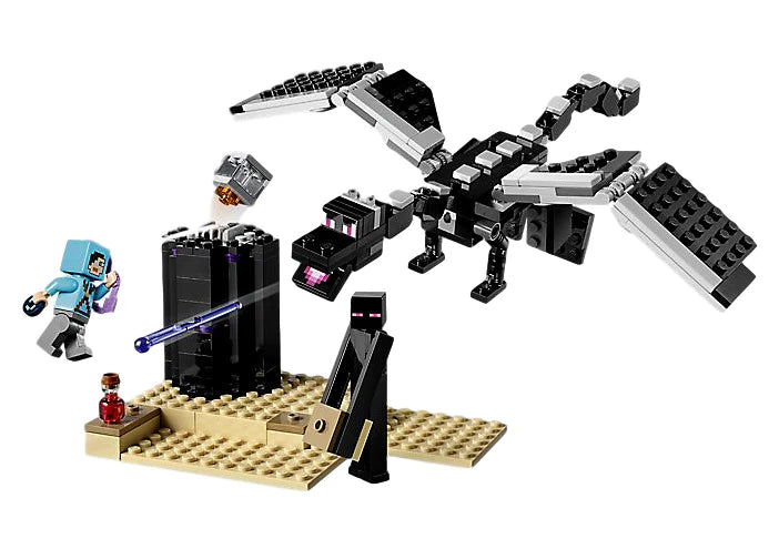 Become a Minecraft" dragon slayer in The End Battle!Grab your potion, ender pearl and enchanted bow, and prepare for the ultimate Minecraft™ encounter. Destroy the end crystal, defeat the enderman and slay the fireball-shooting ender dragon to win The End Battle! Enjoy hands-on Minecraft adventures with this LEGO® Minecraft set. Combine this model with other sets to create your own unique LEGO Minecraft universe. This set also includes a new-for-January-2019 dragon slayer minifigure and a code to redeem the skin in the Minecraft Bedrock Edition online game.Includes a new-for-January-2019 dragon slayer minifigure, plus ender dragon and enderman figure.This Minecraft™ toy features a buildable ender dragon toy with highly posable limbs and an enderman figure, plus a Minecraft End setting with obsidian pillar and an end crystal with pop-up functionality.Check your dragon slayer armor, grab your potion, ender pearl and enchanted bow, and prepare for The End Battle!