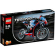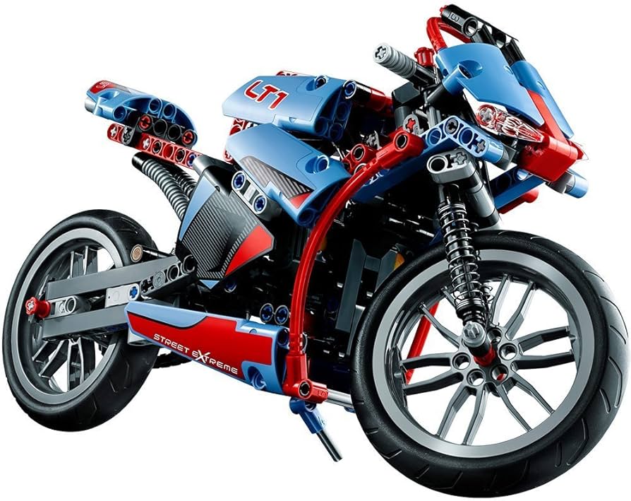 Cruise on the open road with the awesome LEGO® Technic Street Motorcycle! This cool, sturdy model has all the features of the real-life machine, including full fairing, rugged front and rear suspension, chain drive, working steering, kickstand, detailed engine with moving pistons and a sporty, light blue and red color scheme. Experience the joy of motorcycling!